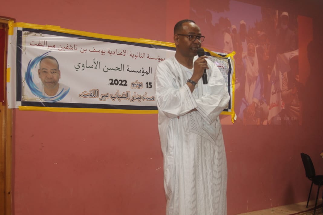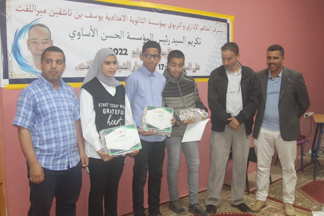 تكريسا لثقافة الاعتراف والشكر، نظمت الأطر الإدارية و التربوية العاملة بالثانوية يوسف ابن تاشفين حفل تكريم على شرف انتقال مديرها الى مديرية مدينة بوجدور ، وكان الحفل الذي أقيم بالقاعة العروض بدار الشباب ميرلفت يومه الأربعاء 15 يونيو الجاري بدأ من الساعة الخامسة مساء ؛ حضره المدير الإقليمي لمديرية وزارة التربية الوطنية والتعليم الأولي والرياضة بسيدي إفني عبد الله بلا بالنيابة و رئيس مصلحة الشؤون التربوية ، وبحضور نائب الاول لرئيس المجلس الجماعي لميرلفت، ورؤساء المؤسسات التعليمية بالحوض المدرسي لميرلفت وبعض رؤساء المؤسسات التعليمية المجاورة ؛ الأطر الإدارية و التربوية بالمؤسسة العاملين بها وبعض المنتقلين خلال فترة جائحة كورونا أوالذين سينتقلون خلال الموسم الدراسي المقبل، رئيس جمعية أمهات و آباء و أولياء التلاميذ المؤسسة وبعض أعضاء المكتب ، بالإضافة إلى عدد من ممثلي جمعيات المجتمع المدني بميرلفت و بعض أمهات وآباء التلاميذ المتوجين في الأسدس الأول وأفراد أسرة المحتفى به.