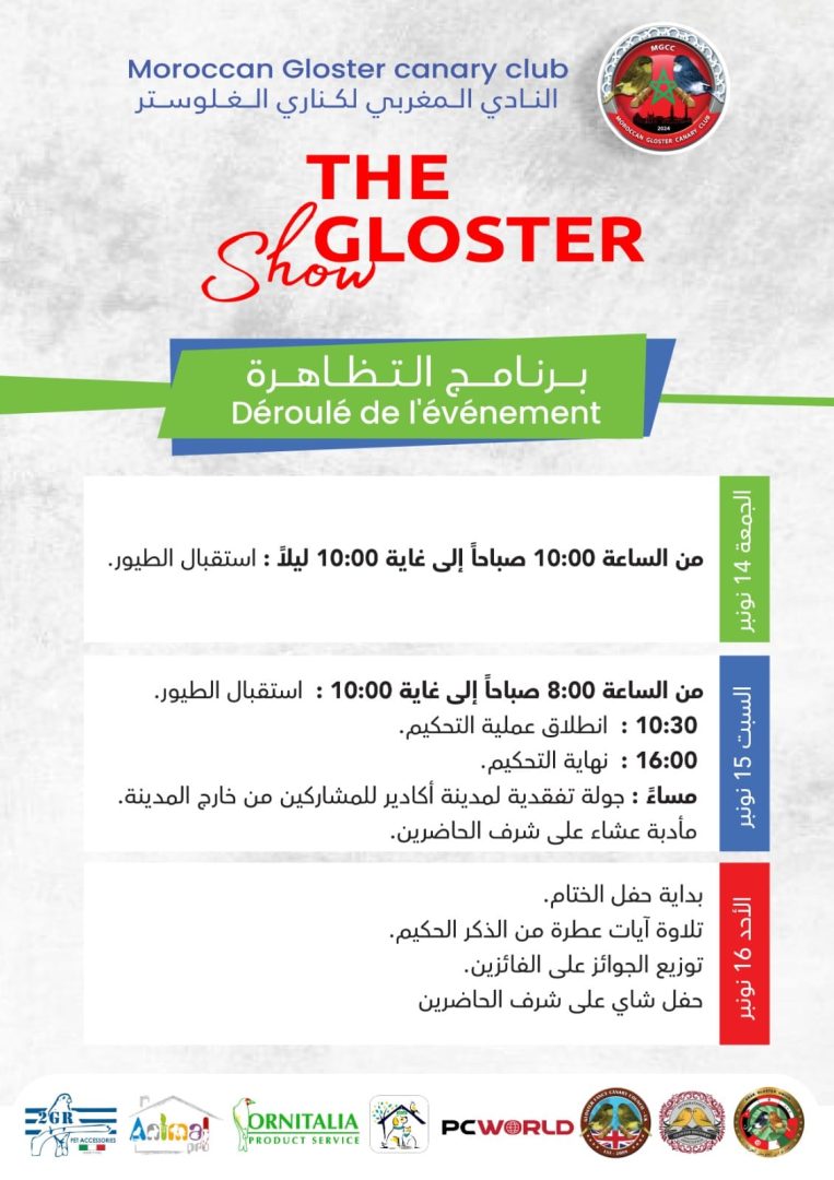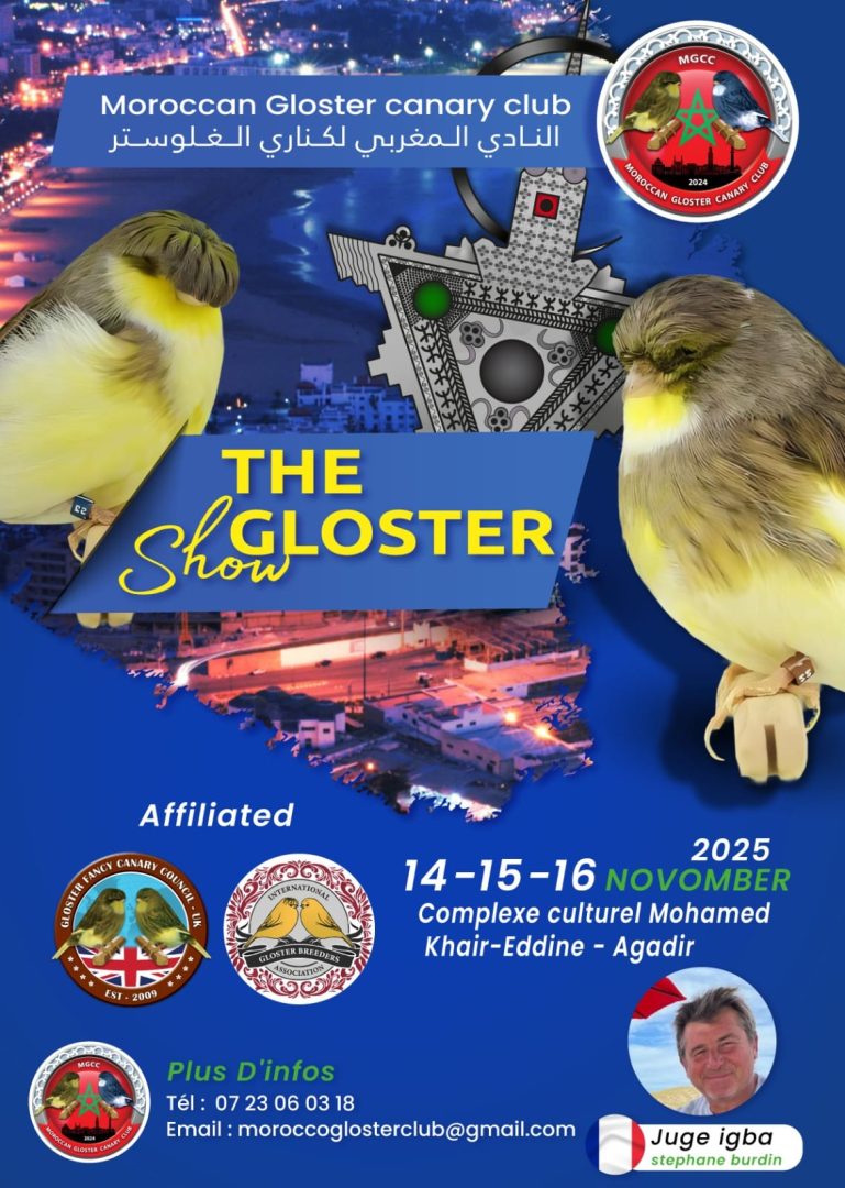 في إطار الارتقاء بهواية تربية طائر الغلوستر بالمغرب، يعلن النادي المغربي لكناري الغلوستر (MGCC) عن تنظيم أول بطولة مغربية لطائر الغلوستر – كأس الغلوستر المغربي، وذلك أيام 14 – 15 – 16 نونبر 2025 بالمركب الثقافي محمد خير الدين – أكادير.