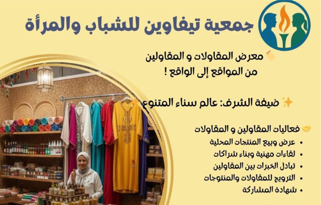 في إطار جهودها الرامية لتعزيز التمكين الاقتصادي ودعم المبادرات المقاولاتية بجهة سوس ماسة، تعلن جمعية تيفاوين للشباب والمرأة عن تنظيم فعاليات “معرض المقاولات والمقاولين” تحت شعار “من المواقع إلى الواقع”، وذلك خلال الفترة الممتدة ما بين 26 و29 يناير 2026 بالمركب الثقافي بإنزكان.