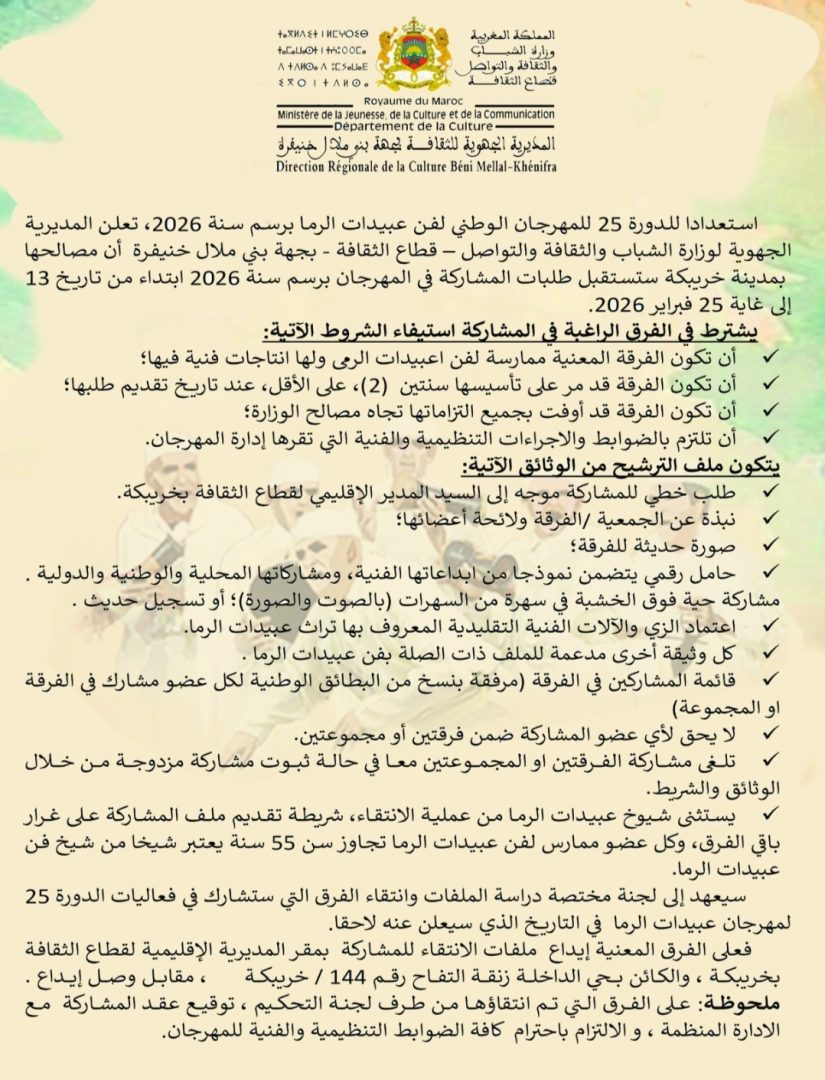 استعدادا لتنظيم الدورة الخامسة والعشرين للمهرجان الوطني لفن عبيدات الرما برسم سنة 2026، أعلنت المديرية الجهوية لوزارة الشباب والثقافة والتواصل – قطاع الثقافة – بجهة بني ملال خنيفرة عن فتح باب استقبال طلبات المشاركة، عبر مصالحها بمدينة خريبكة، خلال الفترة الممتدة من 13 إلى 25 فبراير 2026. ويأتي هذا الإعلان في سياق دينامية ثقافية متواصلة تروم صون أحد أبرز الأشكال التعبيرية التراثية بالمغرب، وترسيخ حضوره في المشهد الفني الوطني ضمن رؤية مؤسساتية قوامها التنظيم والاحترافية وربط المسؤولية بالمحاسبة.