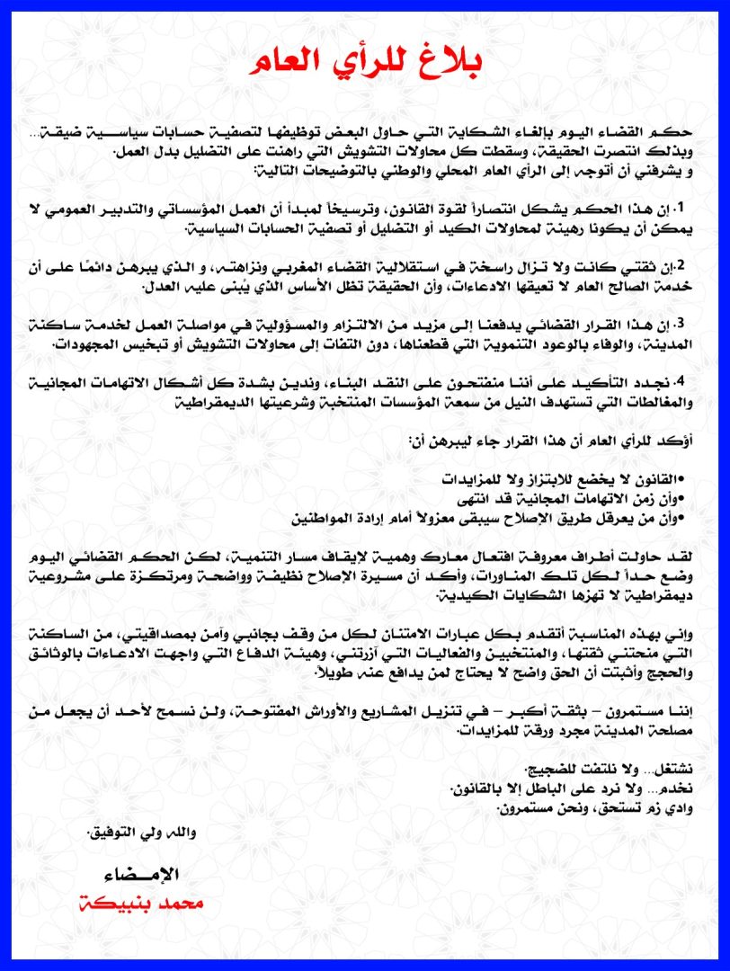 وأوضح البلاغ أن هذا الحكم يشكل دافعاً جديداً لتعزيز الالتزام والمسؤولية في تنزيل المشاريع التنموية، ومواصلة العمل لخدمة ساكنة المدينة دون الالتفات لمحاولات التشويش أو تبخيس المجهودات المبذولة. كما شدد السيد بنبيكة على الانفتاح على النقد البناء، ورفض كل أشكال الاتهامات المجانية والمغالطات التي تستهدف النيل من سمعة المؤسسات المنتخبة وشرعيتها الديمقراطية.