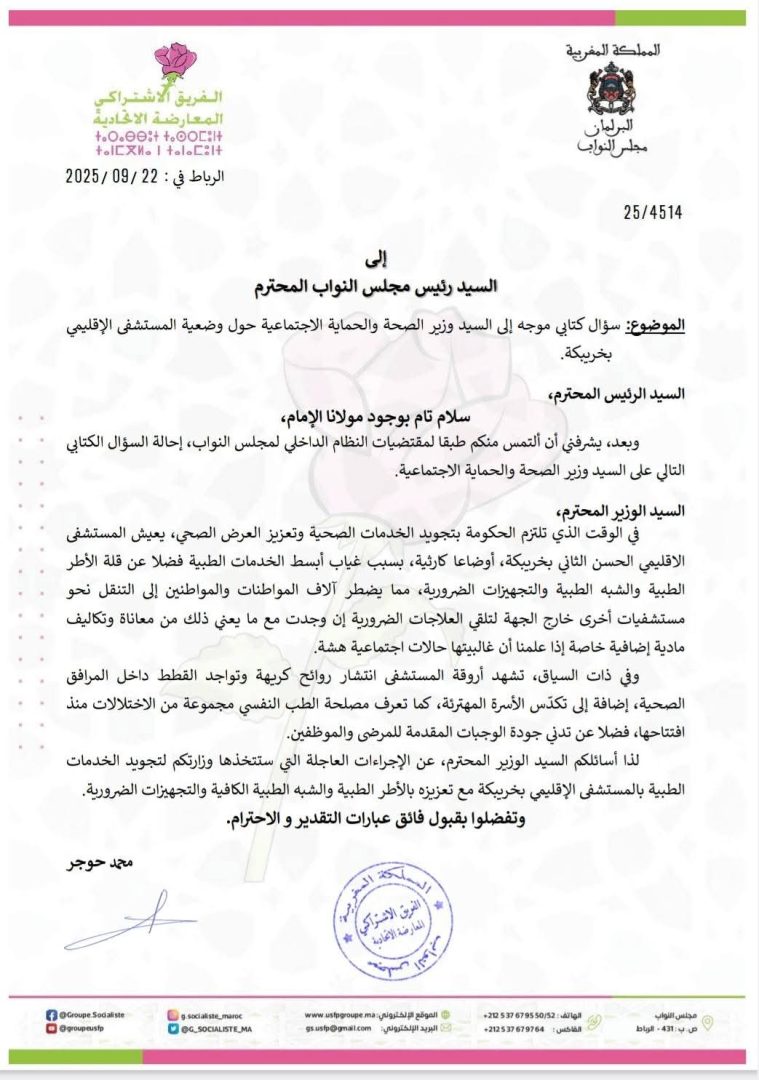 في يوم الاثنين 22 شتنبر 2025، ومباشرة بعد النقاش العمومي الذي عرفه المغرب حول وضعية القطاع الصحي، تقدّم النائب البرلماني محمد حوجر، ممثّل إقليم خريبكة عن حزب الاتحاد الاشتراكي للقوات الشعبية، بسؤال كتابي إلى السيد وزير الصحة والحماية الاجتماعية، يثير من خلاله الوضعية المتدهورة التي يعيشها المستشفى الإقليمي الحسن الثاني بخريبكة.