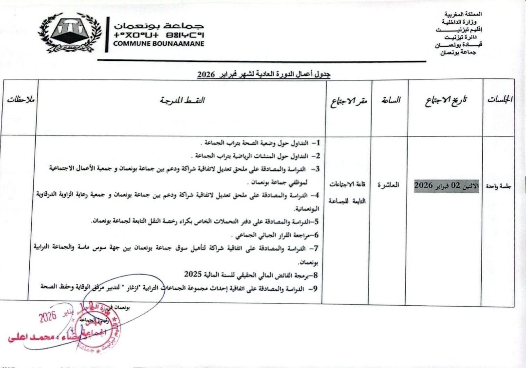 صادق المجلس الجماعي لبونعمان، خلال أشغال دورته العادية لشهر فبراير 2026، المنعقدة صباح يوم الاثنين 02 فبراير 2026 ابتداءً من الساعة العاشرة، على اتفاقية شراكة مع جهة سوس ماسة، تروم تأهيل السوق الأسبوعي بالجماعة، في خطوة تهدف إلى تحسين البنية التجارية المحلية وتعزيز جاذبية الفضاء الاقتصادي بالمنطقة.