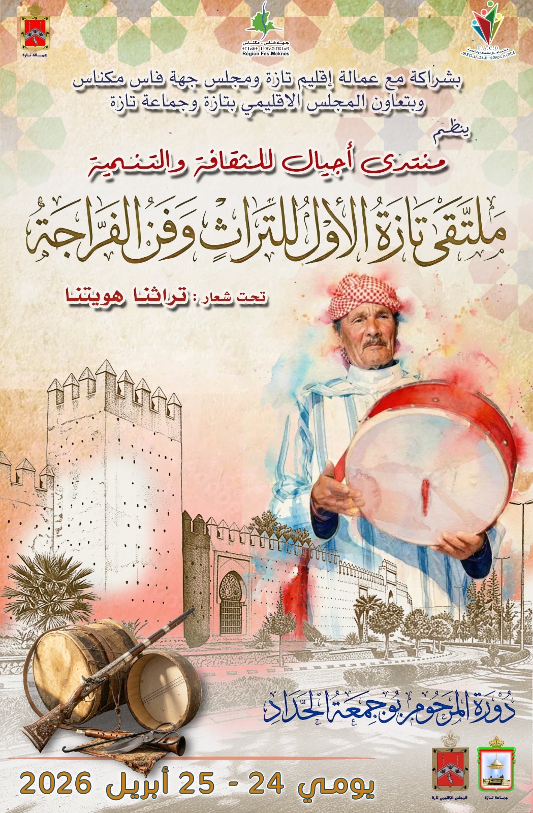 ويُنظم هذا الملتقى من طرف منتدى الأجيال للثقافة والتنمية، بشراكة مع جهة فاس مكناس وعمالة إقليم تازة، وبتعاون مع المجلس الإقليمي لتازة وجماعة تازة، إلى جانب عدد من الشركاء المؤسساتيين الداعمين للعمل الثقافي بالإقليم.