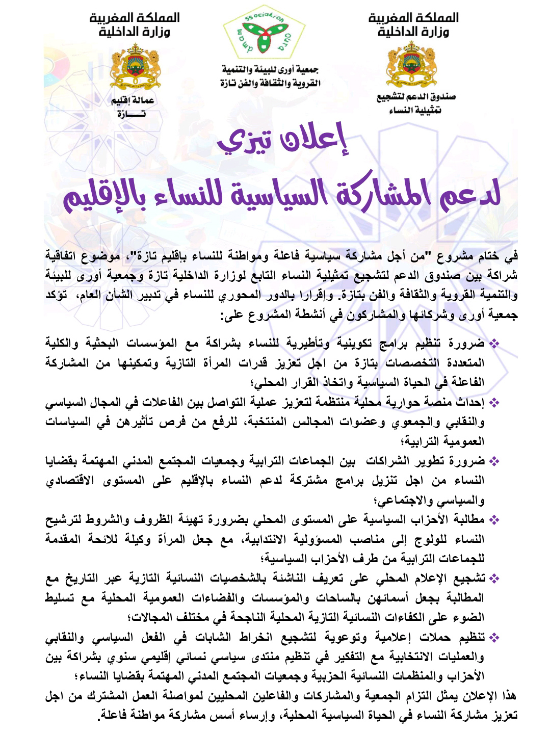 نظمت جمعية أورى للبيئة والتنمية القروية والثقافة والفن بمدينة تازة، بشراكة مع وزارة الداخلية وعمالة إقليم تازة وبدعم من صندوق الدعم، ندوة صحفية تهدف إلى إطلاق مشروع استراتيجي لتعزيز المشاركة السياسية والمواطِنة الفاعلة للنساء بالإقليم. وقد مثلت هذه الندوة منصة رسمية لعرض مضامين المشروع وأهدافه، وفتح نقاش علمي حول الآليات العملية لتنفيذه، فضلاً عن استشراف أثره المتوقع على تمكين النساء وتقوية حضورهن في الحياة العامة والمجتمع المحلي.