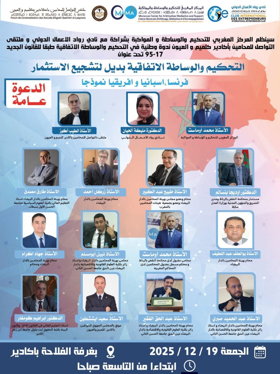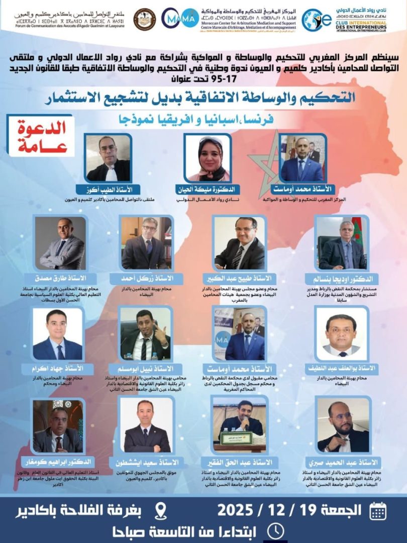 بمناسبة إعلان حفل تخرج الفوج الثاني للمركز المغربي لتحكيم والوساطة والمواكبة، ستنظم الندوة الوطنية حول “مستجدات التحكيم والوساطة الاتفاقية في ظل القانون رقم 95.17” يوم 19 دجنبر 2025 بغرفة الفلاحة بأكادير. هذه الندوة هي ثمرة شراكة بين المركز المغربي للتحكيم والوساطة والمواكبة، ونادر والأعمال الدولي، وملتقى التواصل المحامون بأكادير وكلميم والعيون.