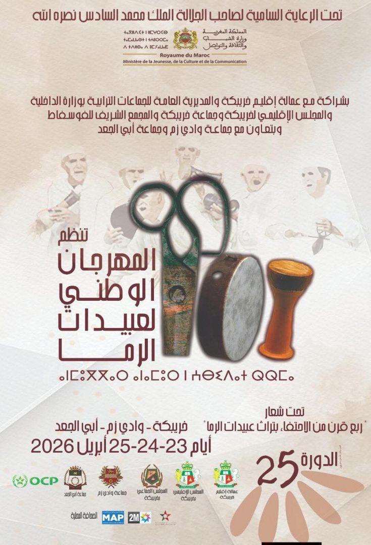تحت الرعاية السامية لصاحب الجلالة الملك محمد السادس نصره الله، تستعد مدينة خريبكة لاحتضان حدث ثقافي وطني وازن، يتمثل في الدورة الخامسة والعشرين للمهرجان الوطني لفن عبيدات الرما، وذلك خلال الفترة الممتدة من 23 إلى 25 أبريل 2026، تحت شعار دالّ ومكثف: “ربع قرن من الاحتفاء بتراث عبيدات الرما”.