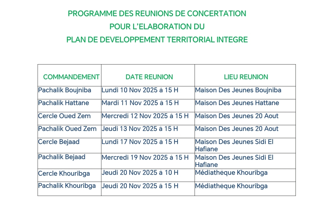وفيما يلي برنامج اللقاءات التشاورية التي أعلنت عنها عمالة إقليم خريبكة: