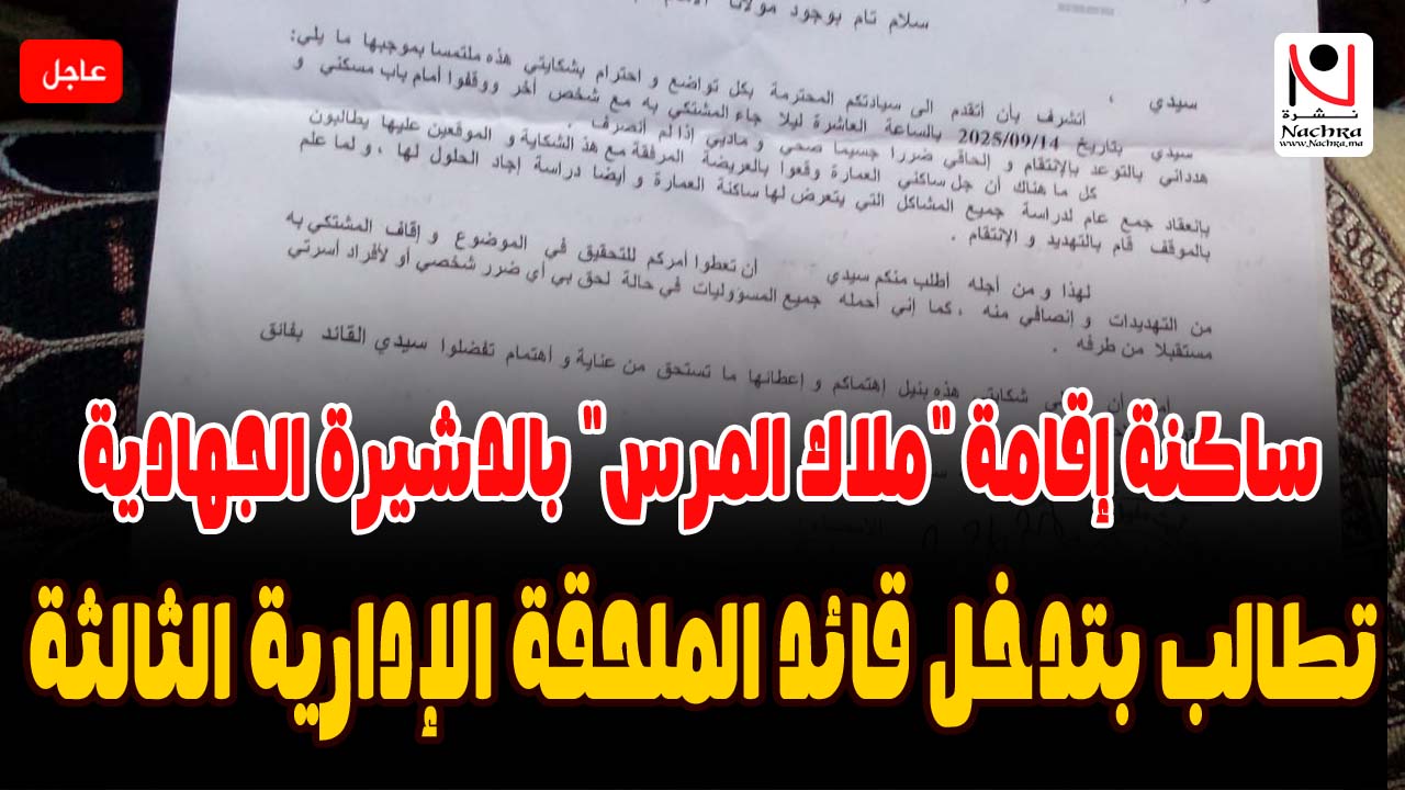 طالبت ساكنة إقامة ملاك المرس بمدينة الدشيرة الجهادية بعقد الجمع العام الخاص باتحاد الملاك، مؤكدة في شكايات ومراسلات عديدة وُجّهت إلى رئيس الاتحاد وإلى قائد الملحقة الإدارية الثالثة بتسلا اكادير بضرورة التدخل العاجل.