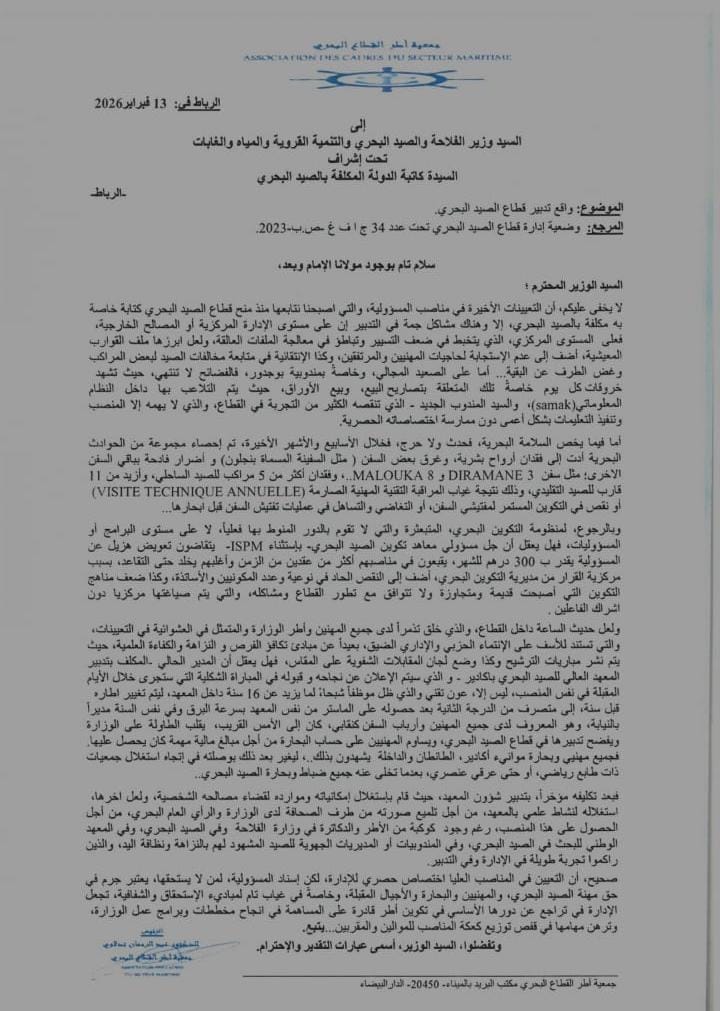وتتساءل الشكاية عن المنظومة التكوين البحري المتبعثرة والتي لا تقوم بالدور المنوط بها فعليا. وتتهم مسؤولي معاهد تكوين الصيد البحري بالتقاضي تعويضاً هزيلاً عن المسؤولية، ويقبعون في مناصبهم أكثر من عقدين من الزمن بسبب مركزية القرار.