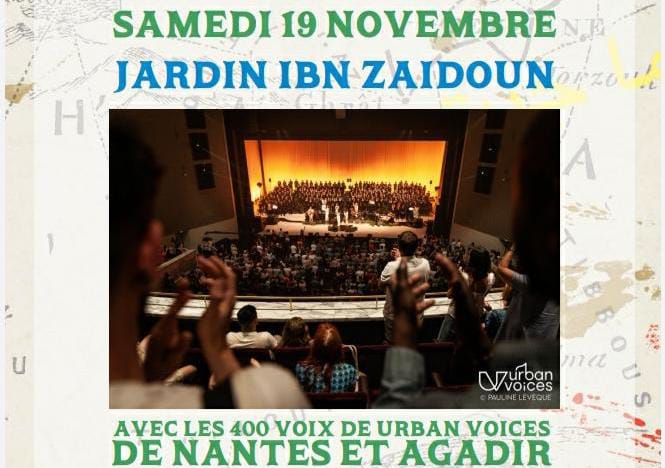 وحسب بلاغ المنظمين فان هذا المشروع الذي يصادف الثلاثين سنة من التعاون بين المدينتين أكادير المغربية ونانت الفرنسية، يعمل حاليا على تنظيم ورشات تدريبيّة مكثّفة لما يقارب مائة مشترك ومشتركة من أكادير سيلتقون بالكورال من نانت، والذي يتألّف من ثلاثمائة هاوي موسيقي من نانت برفقة الفرقة الموسيقية URBAN VOICES ، ليقدّموا سويًا حفلا ختاميّا لهذا المشروع بحديقة إبن زيدون بأكادير يوم السبت 19نونبر2022 ابتداء من الساعة السادسة مساء.