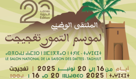 في إطار الدور الحيوي الذي تضطلع به الواحات في الحفاظ على التوازن البيئي والتنوع البيولوجي والثقافي، ومع التحديات الكبرى التي يفرضها التغير المناخي على هذه المناطق، تنظم جمعية موسم التمور، و الجماعة الترابية لتغجيجت وبشراكة مع عدد من المؤسسات الوطنية، الدورة العشرين للملتقى الوطني لموسم التمور بشعار “تثمين التمور دعامة أساسية للفلاحة التضامنية”. ستعقد فعاليات الملتقى أيام 16 و17 و18و19و 20 نونبر 2025، في الفضاءات الثقافية بتغجيجت، بمناسبة الذكرى السبعين لعيد الاستقلال المجيد.