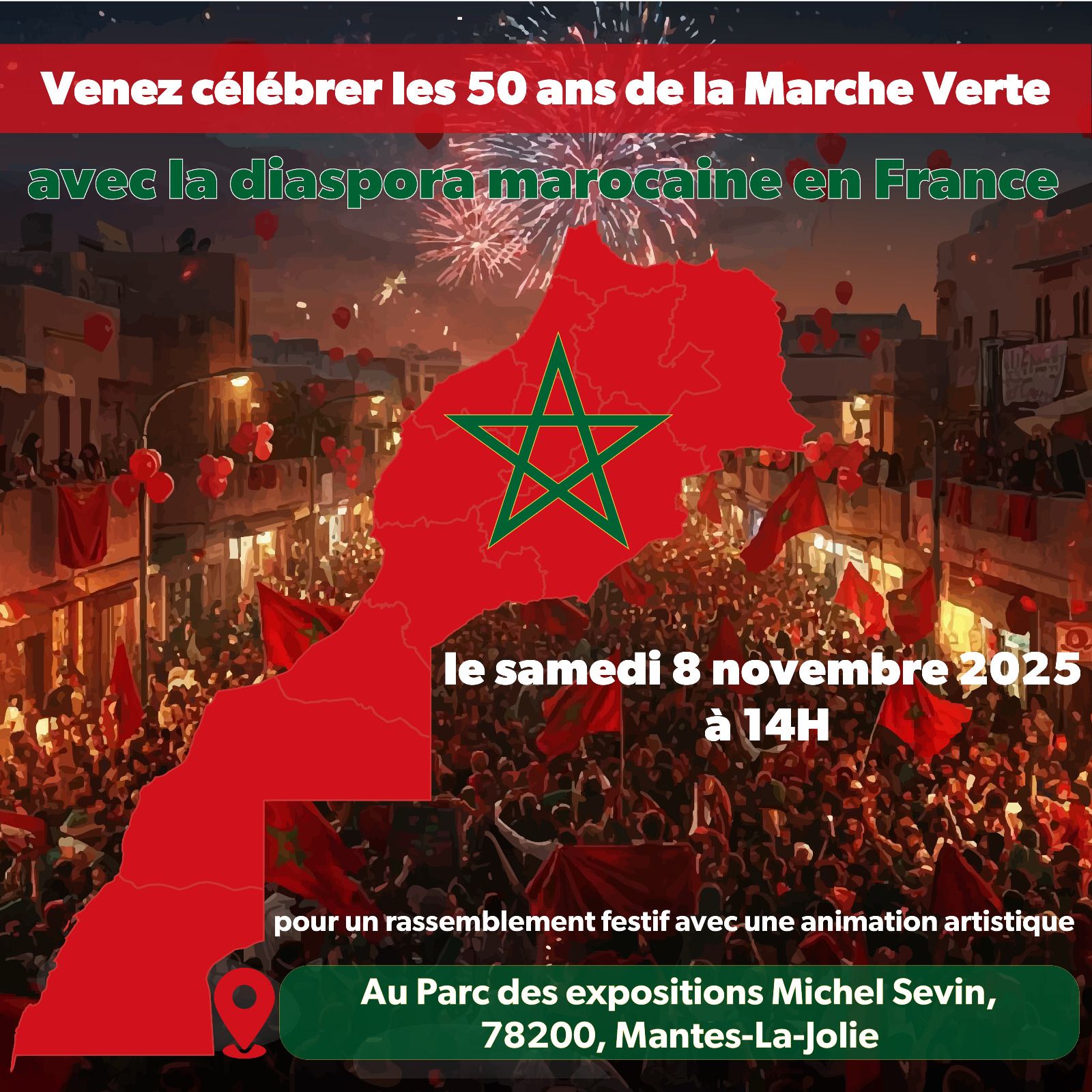 بمناسبة إحياء الذكرى الخمسين للمسيرة الخضراء، وباعتراف المجتمع الدولي بمغربية الصحراء، يسرّ الائتلاف الجمعوي الفرنسي المغربي بإيل دو فرانس ، أن يدعو الجميع للمشاركة في الاستعراض الكبير الذي سيقام يوم السبت 8 نونبر 2025 على الساعة 13:00، ابتداءً من ساحة سانت آن بمدينة مانت لا جولي (78200) وصولاً إلى جزيرة لومون.
